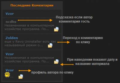 Информер отображает установленое количество самых последних коментариев пользователей к материалам сайта.