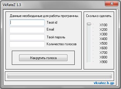 VKRate 1.3 - Программа предназаненная для накртуки рейтинга ВКонтакте, до 900 голосов мгновенно. Программа может быьт использована 1 раз на 1 идентификатор.